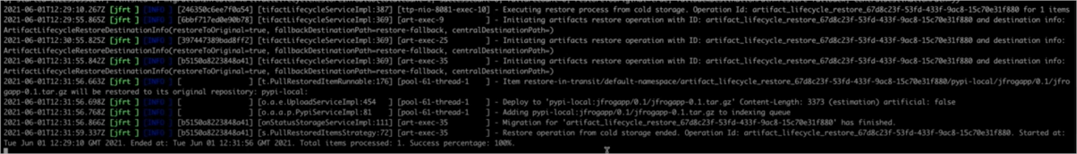 2023-06-27T06:45:57.542Z [jfrt ] [INFO ] [3a80716725fdf1b8] [ifactRetentionServiceImpl:1145] [27.0.0.1-8081-exec-3] - Executing restore process from cold storage. Operation Id: retention_restore_package_URPXF4HBCL for 1 items
