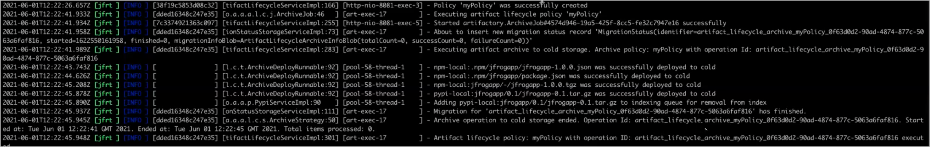 Cold Storage adds dedicated logs in the Live Artifactory service logs for the events that are related to the artifacts and packages being archived, including running archiving policies and the archive process itself. The following events are documented in the log: