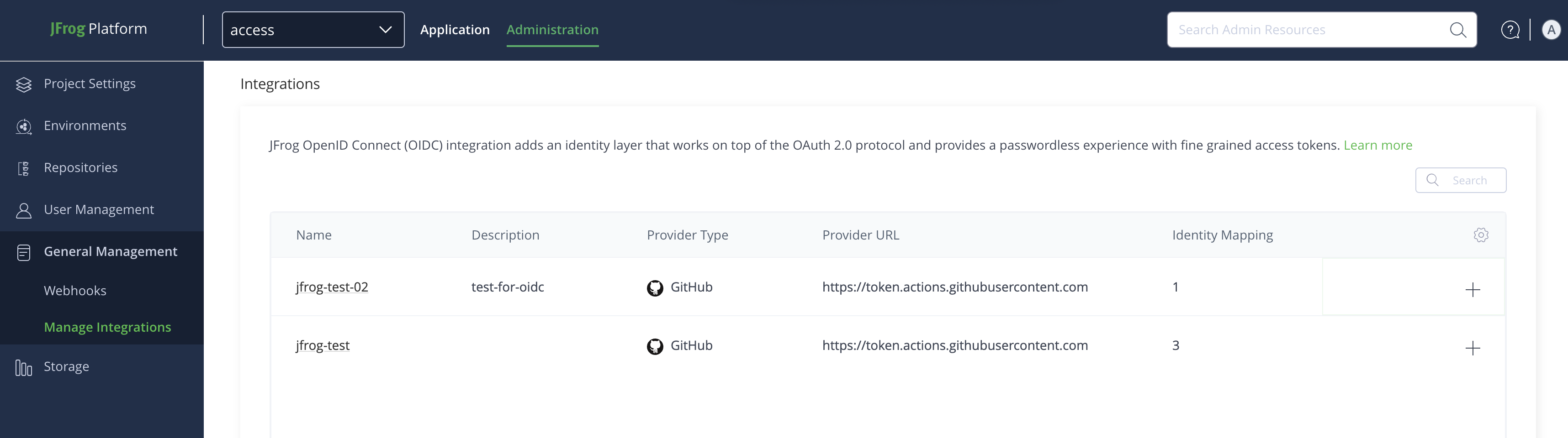 To view the OIDC providers you have configured, go to General Management > Manage Integrations. The list of OIDC provider configurations defined in Artifactory is displayed in the list section.