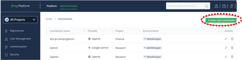 When you select a project for allowing a model, and you do not have any models from the same provider already allowed for that project, you must create a new connection.