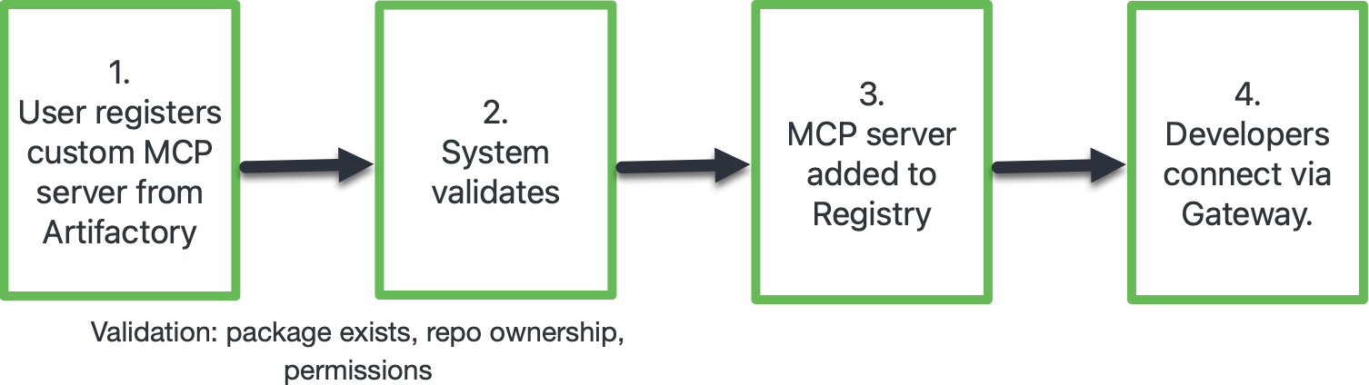 To ensure a trusted supply chain, the package and its optional README.md must first exist in a local Artifactory repository before it can be registered and governed by the MCP Registry.