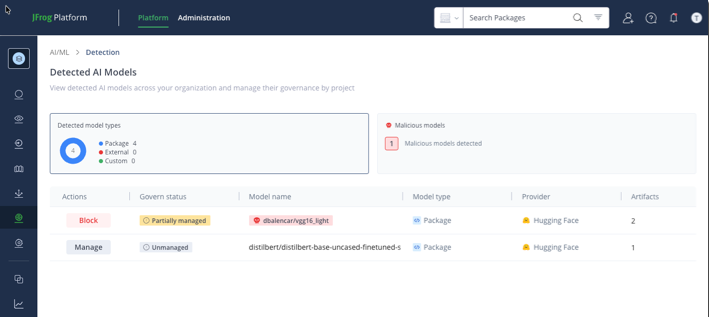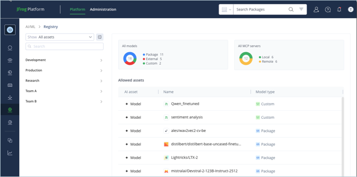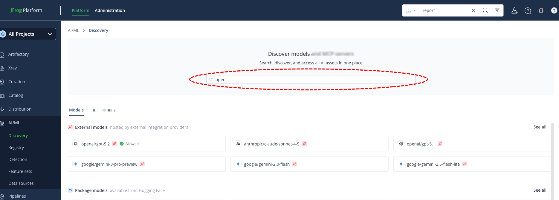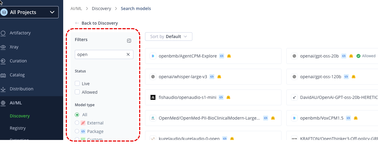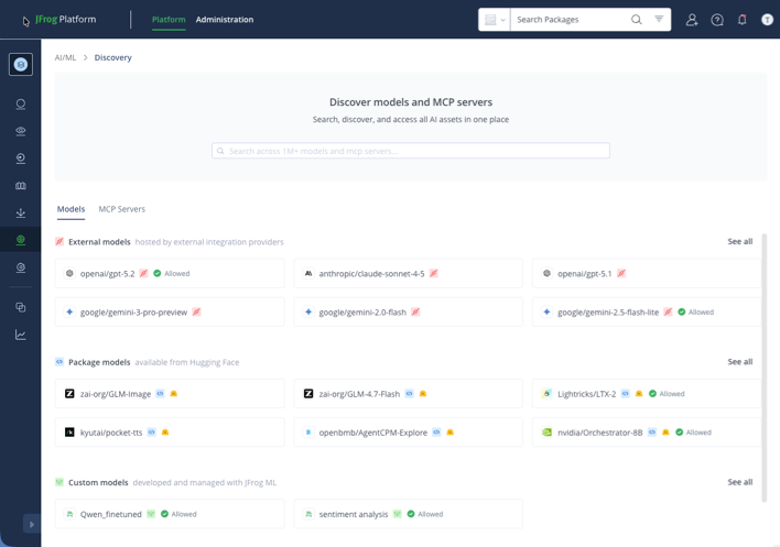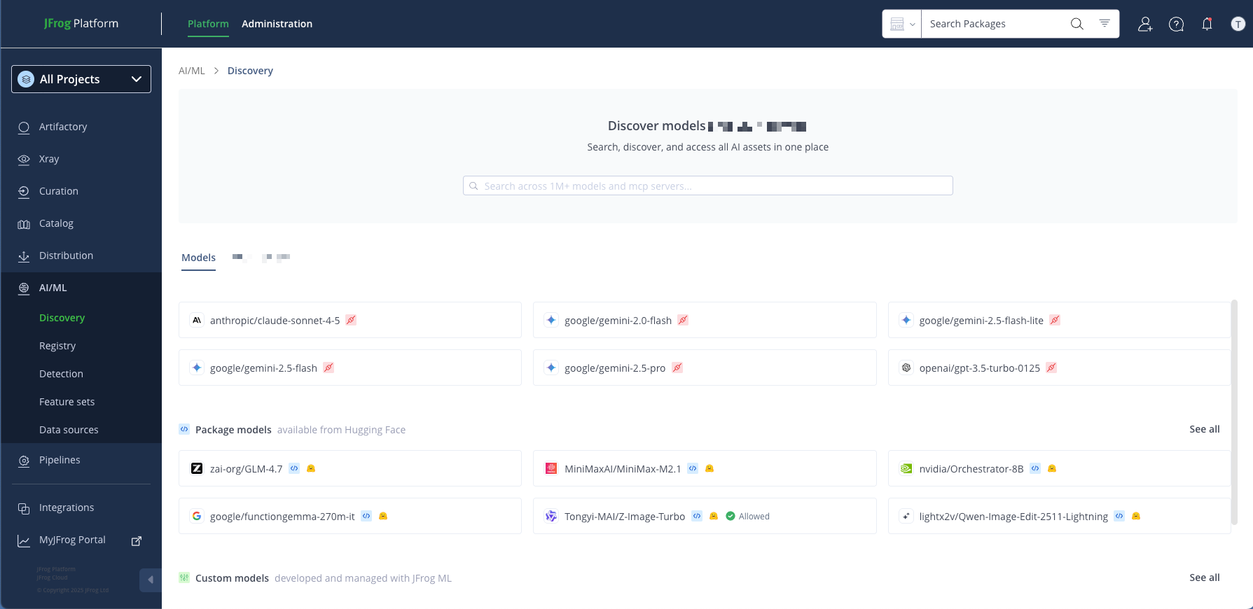 From the JFrog platform menu, select AI/ML > Discovery. The Models Discovery page opens. (If you are selecting your first model, the Registry page is empty.)