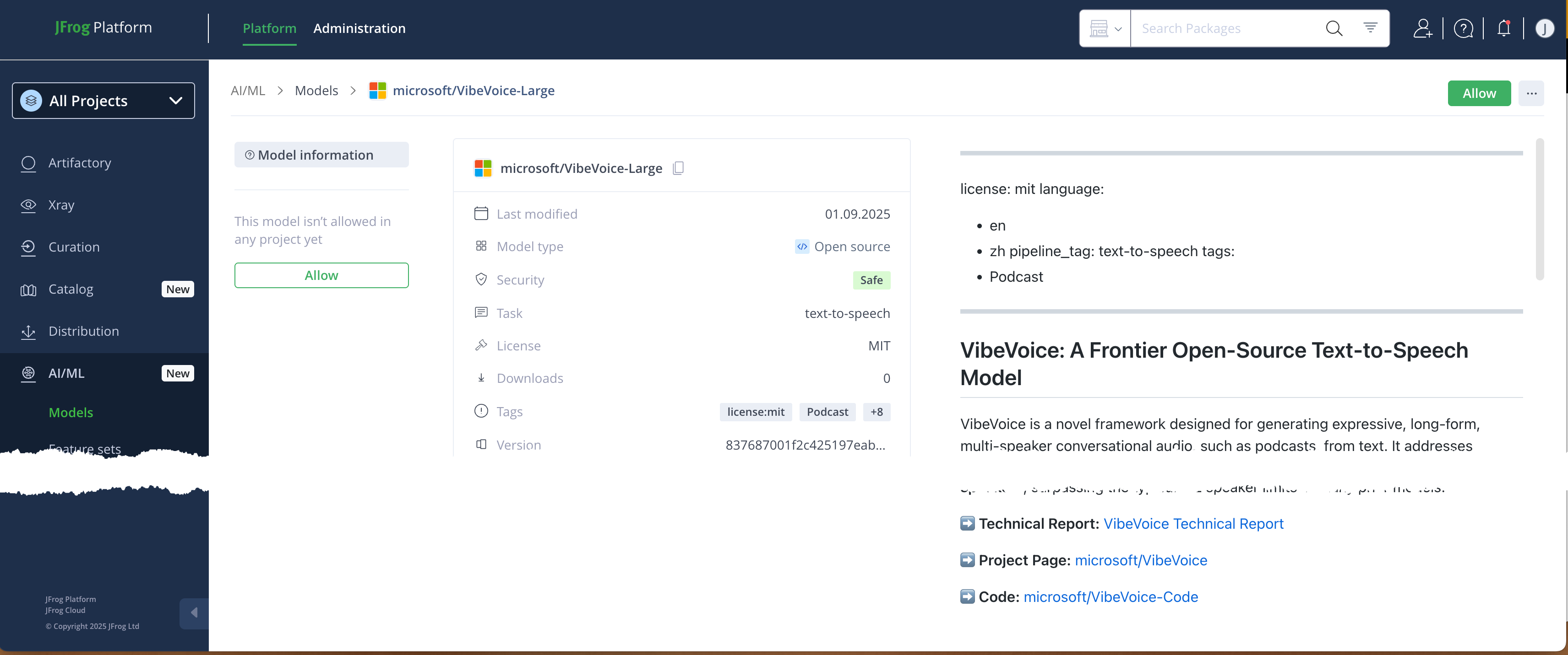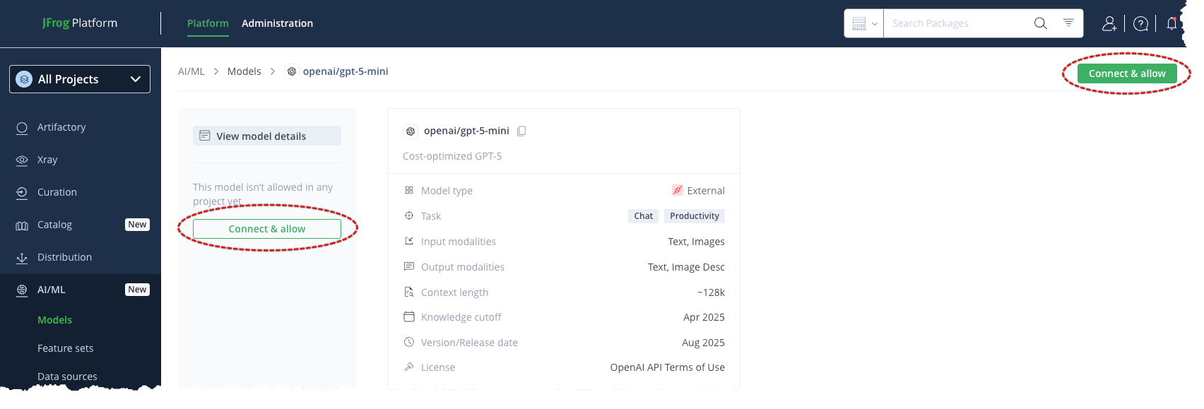 Click the model you wish to allow. The model details are displayed. To enable your developers to use this model, assign it to a project, connect it (for external models), and allow it.