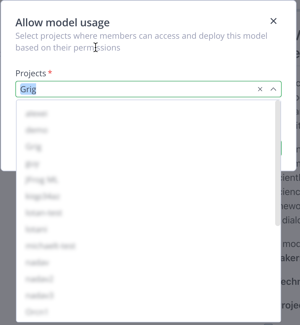 - In the Allow Model Usage pane, select the project from the drop-down list.