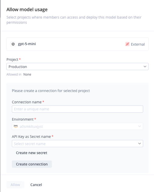 ² When allowing a model for which a connection is already set up between the project and the model provider, you do not need to define a new connection.