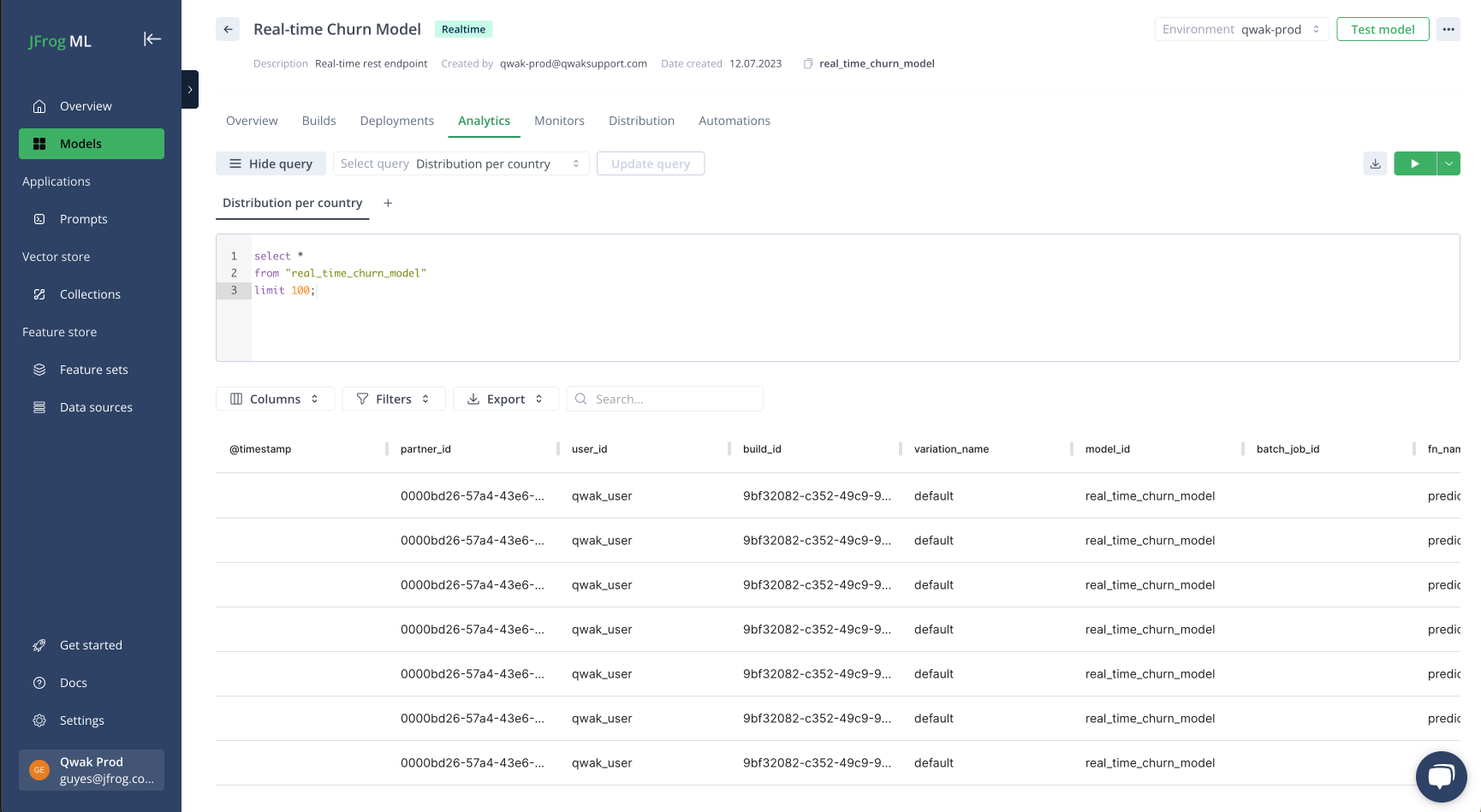 Querying model predictions is an essential step in the machine learning development process. With JFrog ML, it's easy to query your model's predictions and view relevant metrics.