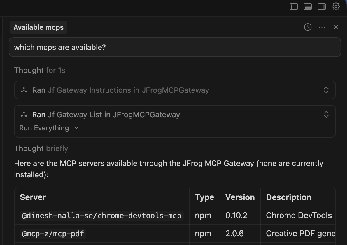 Because the MCP Gateway exposes its management capabilities directly to your IDE, you can interact with the JFrog MCP Registry through your AI agent's chat interface using natural language.
