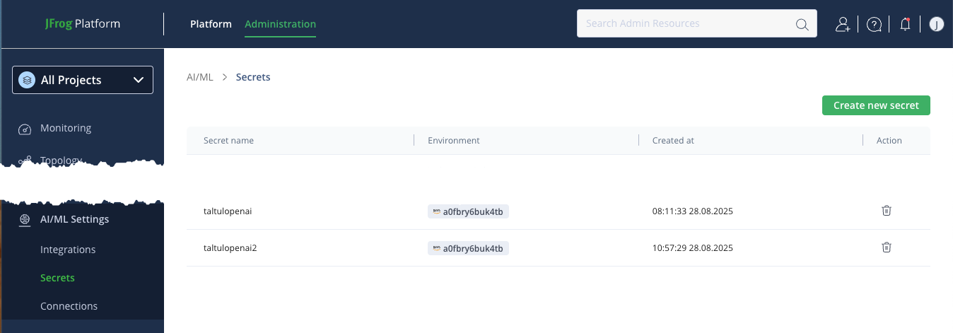 - In the left menu navigate to5 AI/ML Settings > Secrets. The Secrets page displays a list of all your current secrets.