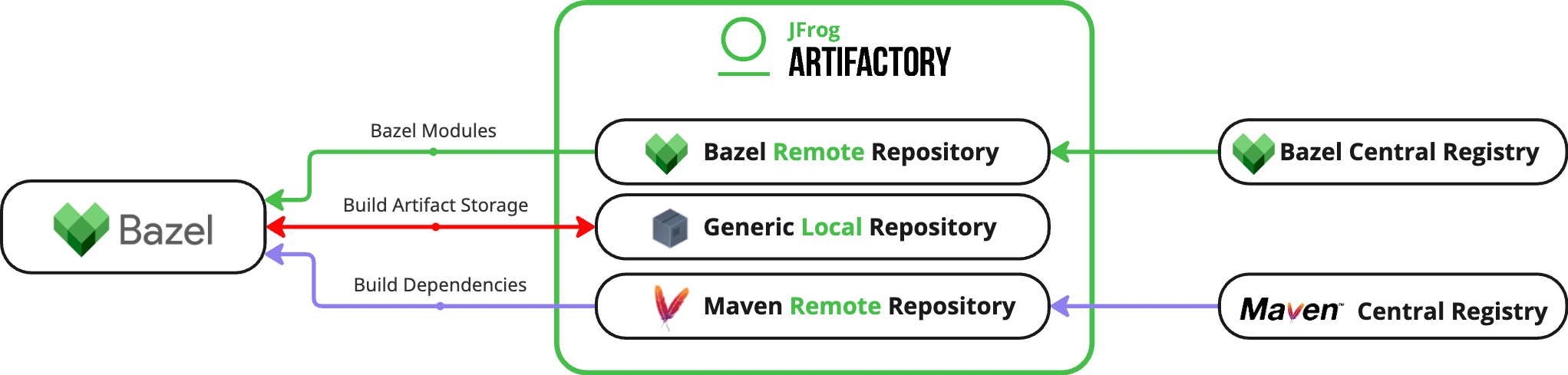 - Bazel Build Artifacts: Bazel Modules repositories are for module dependency management only, and do not support build artifacts. To use Artifactory for handling Bazel build artifacts and other dependencies, use Generic and Maven repositories. For more information, see Additional Bazel Information.