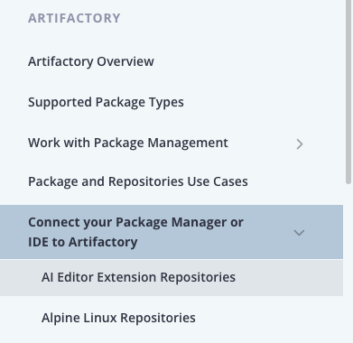 - From the table of contents to the left hand side of this window: Select the relevant package or repository type. For example, AI Editor Extension Repositories.