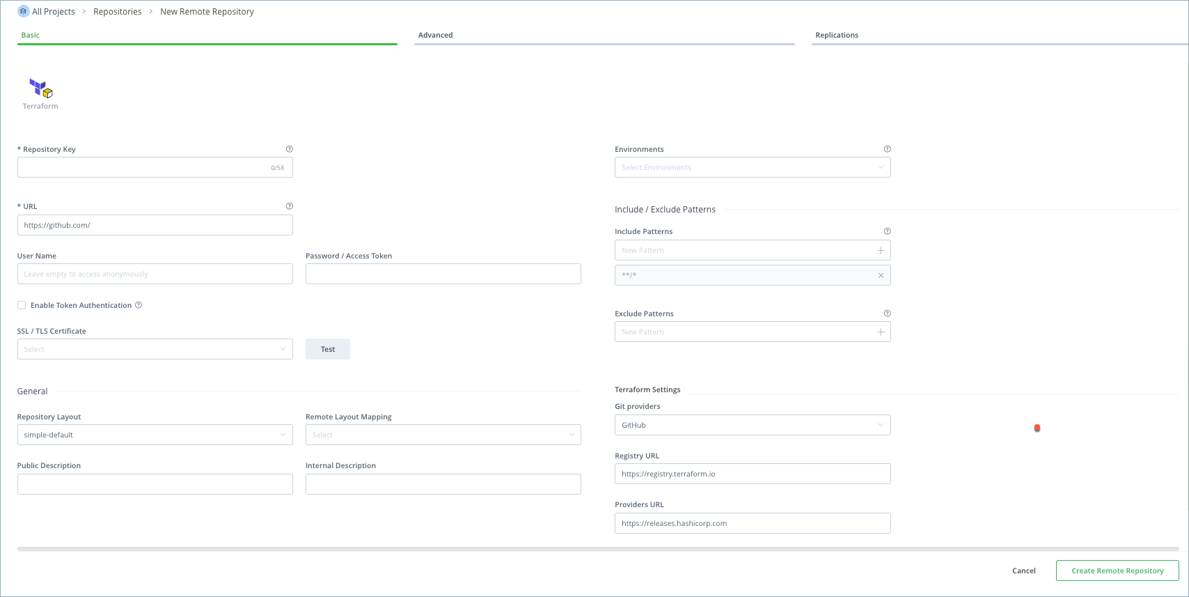 .tffiles kept together in a directory.The Modules and Providers have different settings for local repositories, but are the same when it comes to configuring remote and virtual repositories.