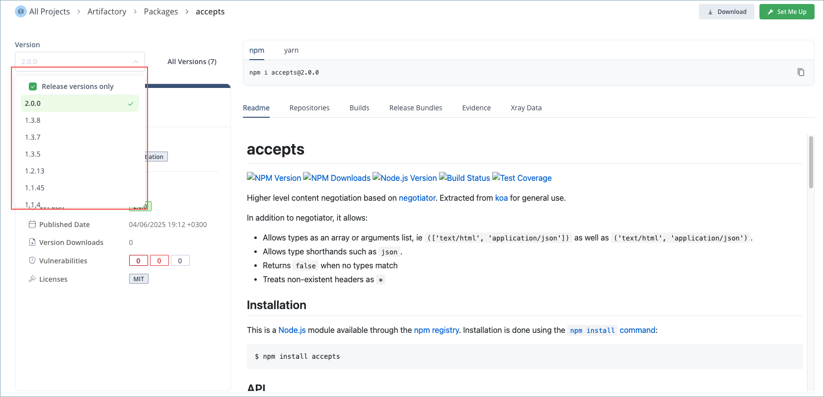 Xray Data: This tab lists Xray security data related to the package version. For more information on the Xray security scan, see Xray.