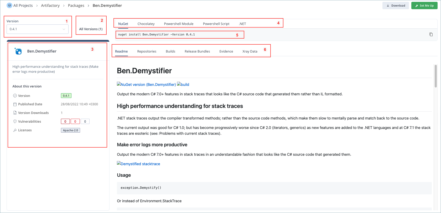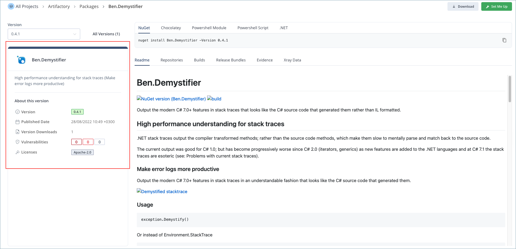 Readme: This tab shows the Readme documentation for the package version, if available.
