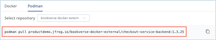 If the package you are viewing has more than one client, this will be indicated in the package details screen. In the example below, this Docker package has two clients, Docker and Podman. Note the installation command, which is set for the currently selected client and repository. You can copy the installation command by clicking the copy icon on the right and use it to install your package.