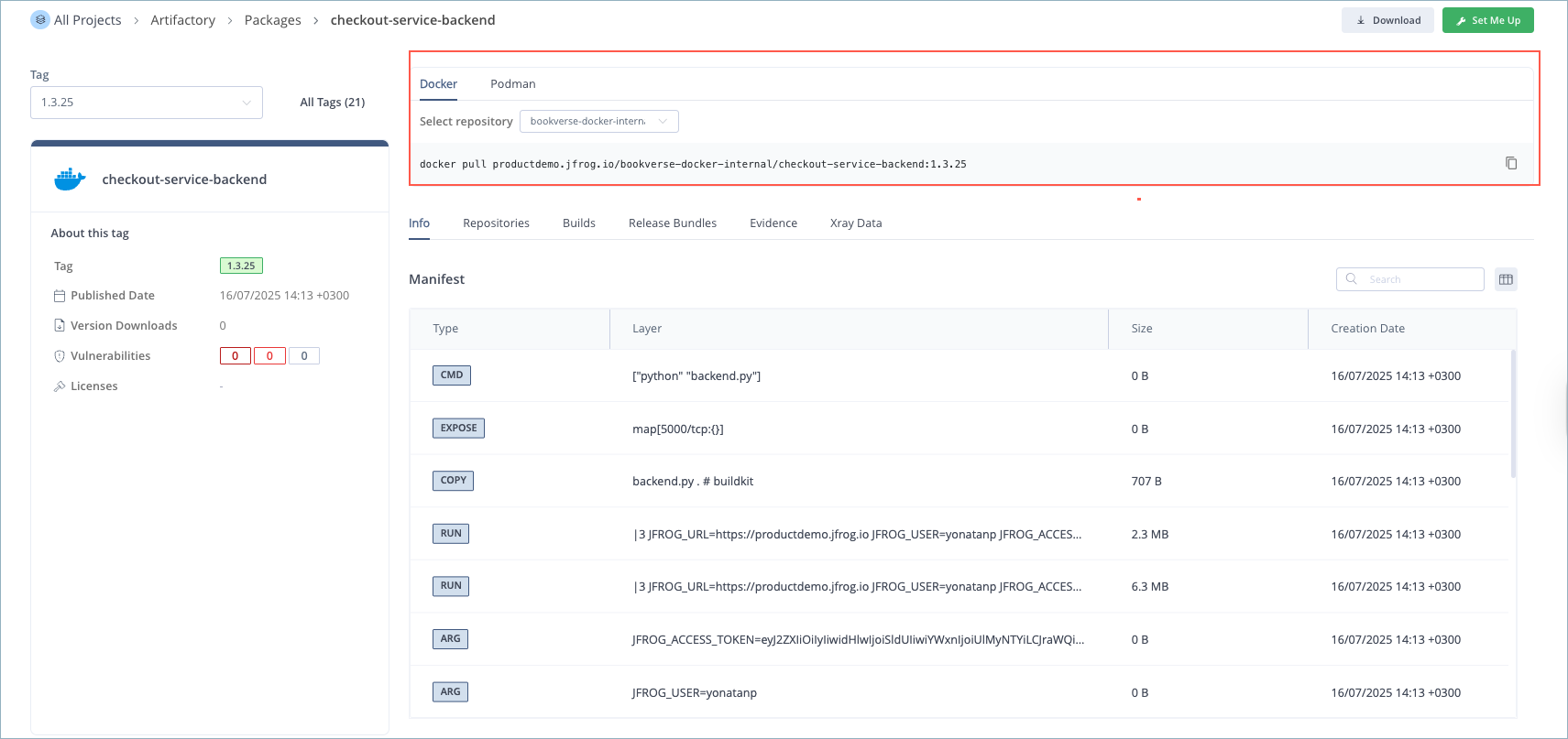 Info: This tab shows information relevant to the package version. For Docker, Helm OCI, and OCI package versions, it shows the Manifest or List Manifest for Docker and OCI images.