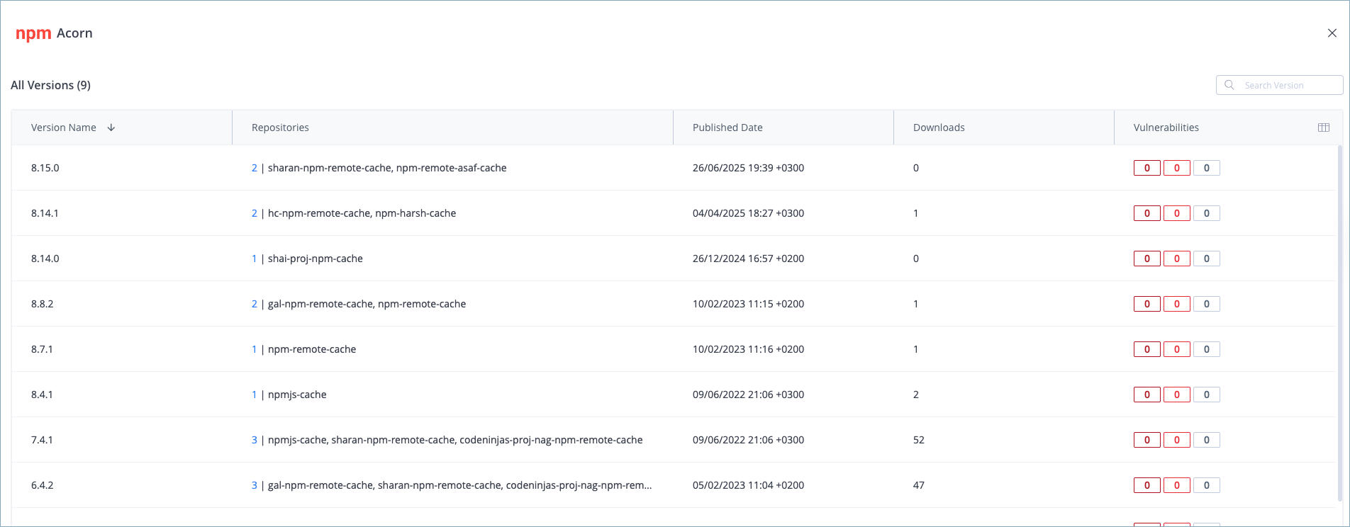 - An option to view all package versions, their vulnerabilities, and where they are stored for impact analysis and easy version selection