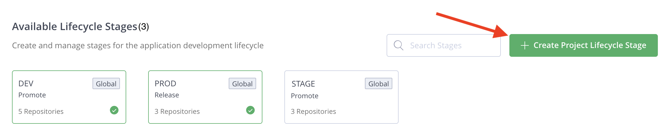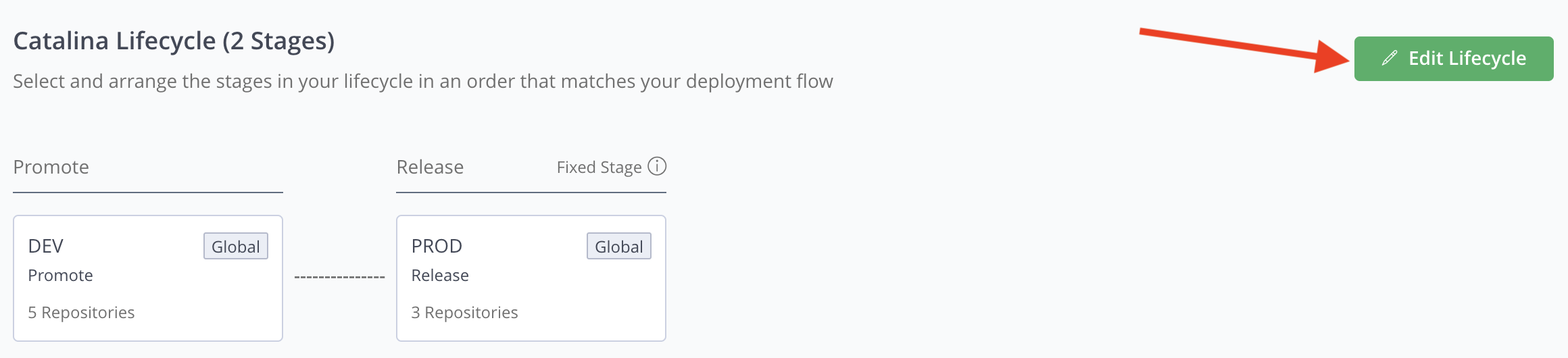 - Ensure the first stage in the lifecycle has at least one repository assigned to it. To assign a repository, see Assign Repositories to Stages in the Platform UI. Other stages do not require a repository to be assigned.