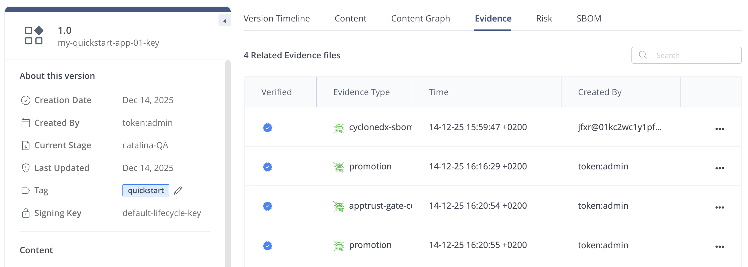 jf apptrust version-create my-quickstart-app-key 1.0 --source-type-packages "type=Docker, name=catalina, version=1.0.2, repo-key=catalina-dev-docker-local" --tag="quickstart"You should see output like the following: