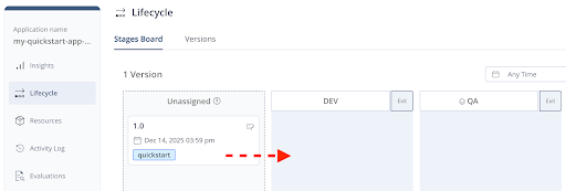 - In the left column of the Applications page, click Lifecycle. The Stage Board appears, and in the Unassigned column, you can see the Application Version that you created. The version has not yet been promoted to a stage.