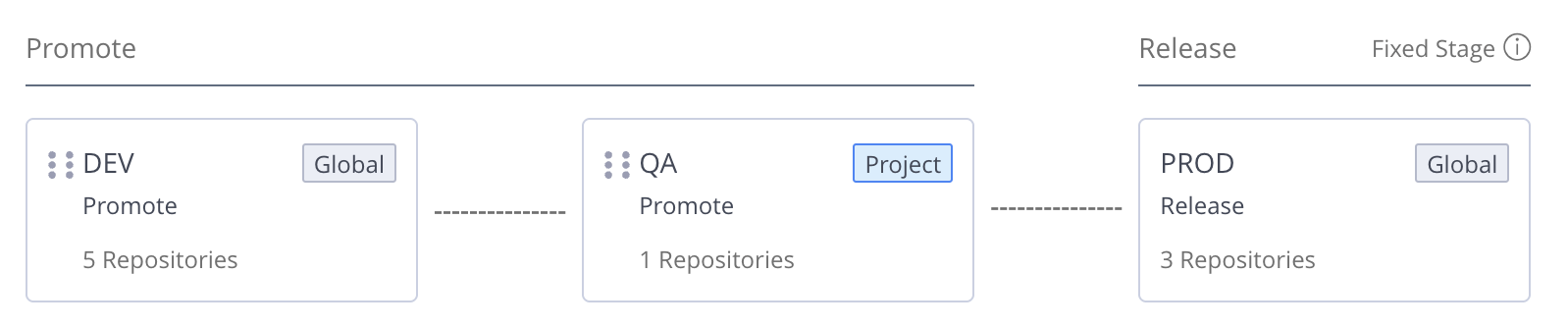 Stages, such as DEV, QA, and PROD, are logical entities that enable you to track the maturity level of an application version in the Software Development Lifecycle (SDLC). You can define stages that apply to a specific project, or you can create global stages that can be applied in all projects.