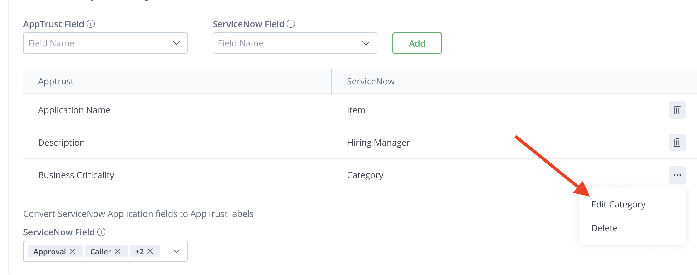 To map ServiceNow fields to AppTrust labels: