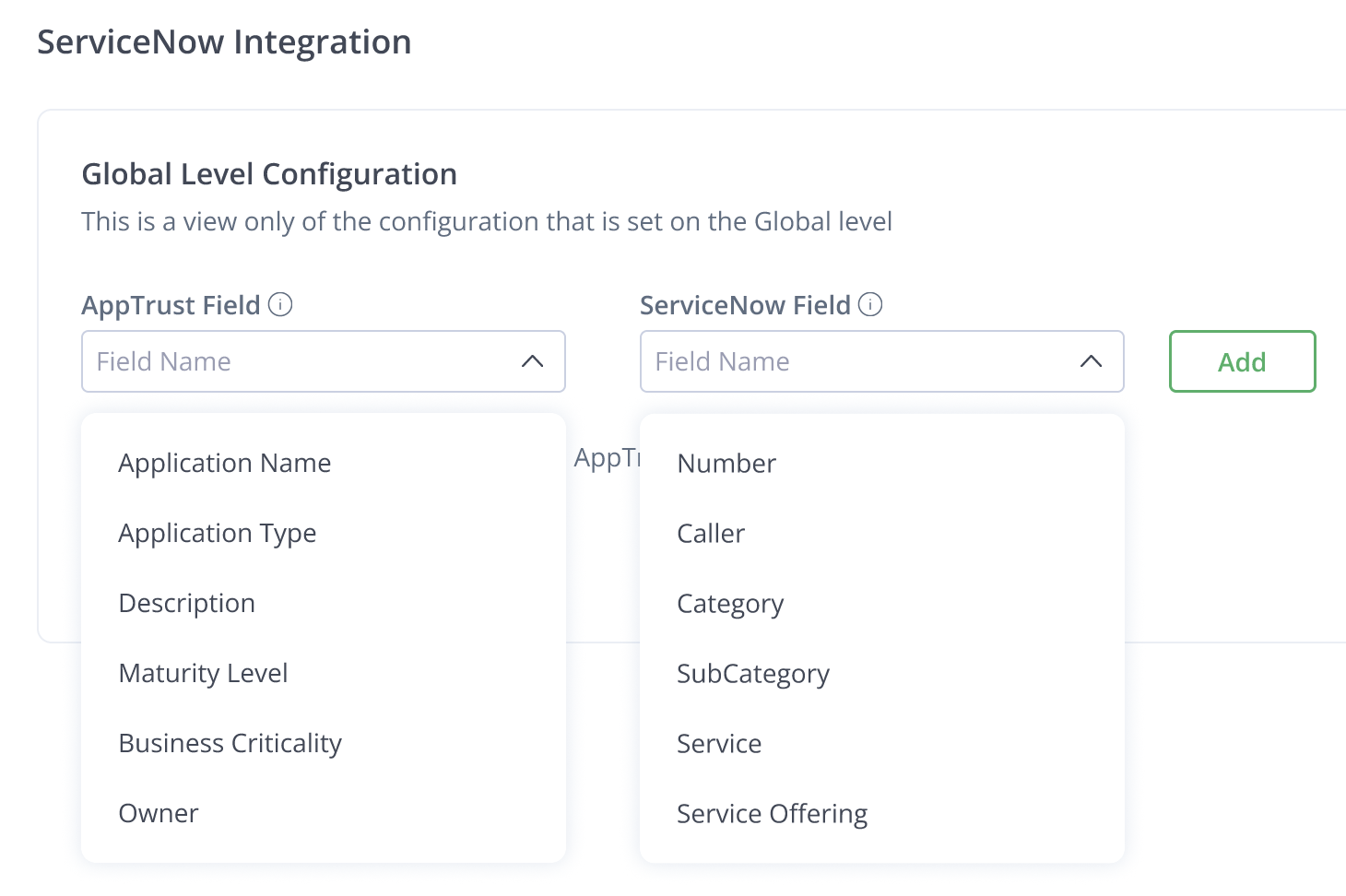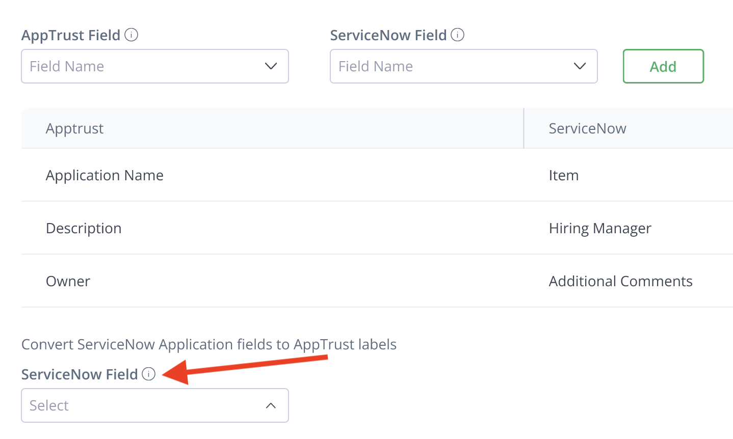 In ServiceNow Field, choose the item that will be used to represent the AppTrust Field in ServiceNow, and click Add.