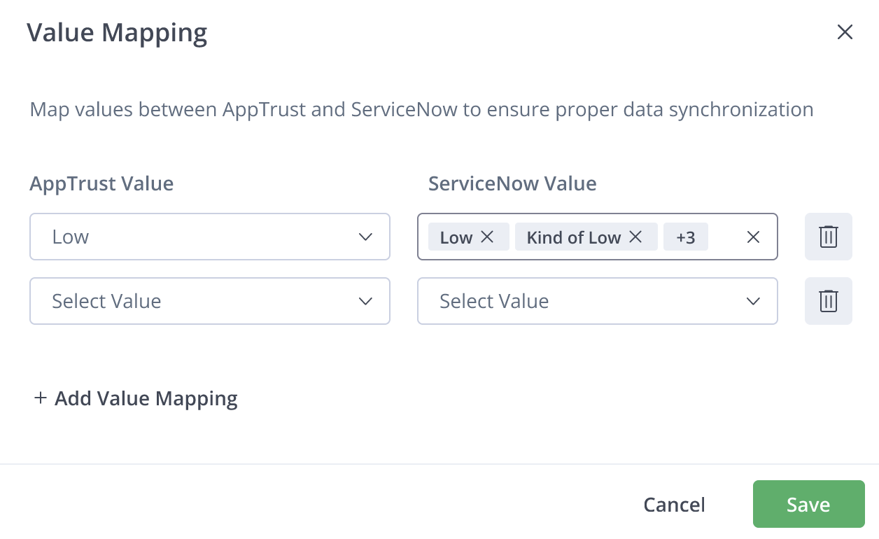 - After you click Add in Step 2, a popup will appear for fields that require mapping of sub-fields (also called values). For example, for Criticality, you will also have to map its values of High, Medium, and Low. In the Value Mapping popup, choose the ServiceNow values to be equated with the AppTrust values, and click Save.