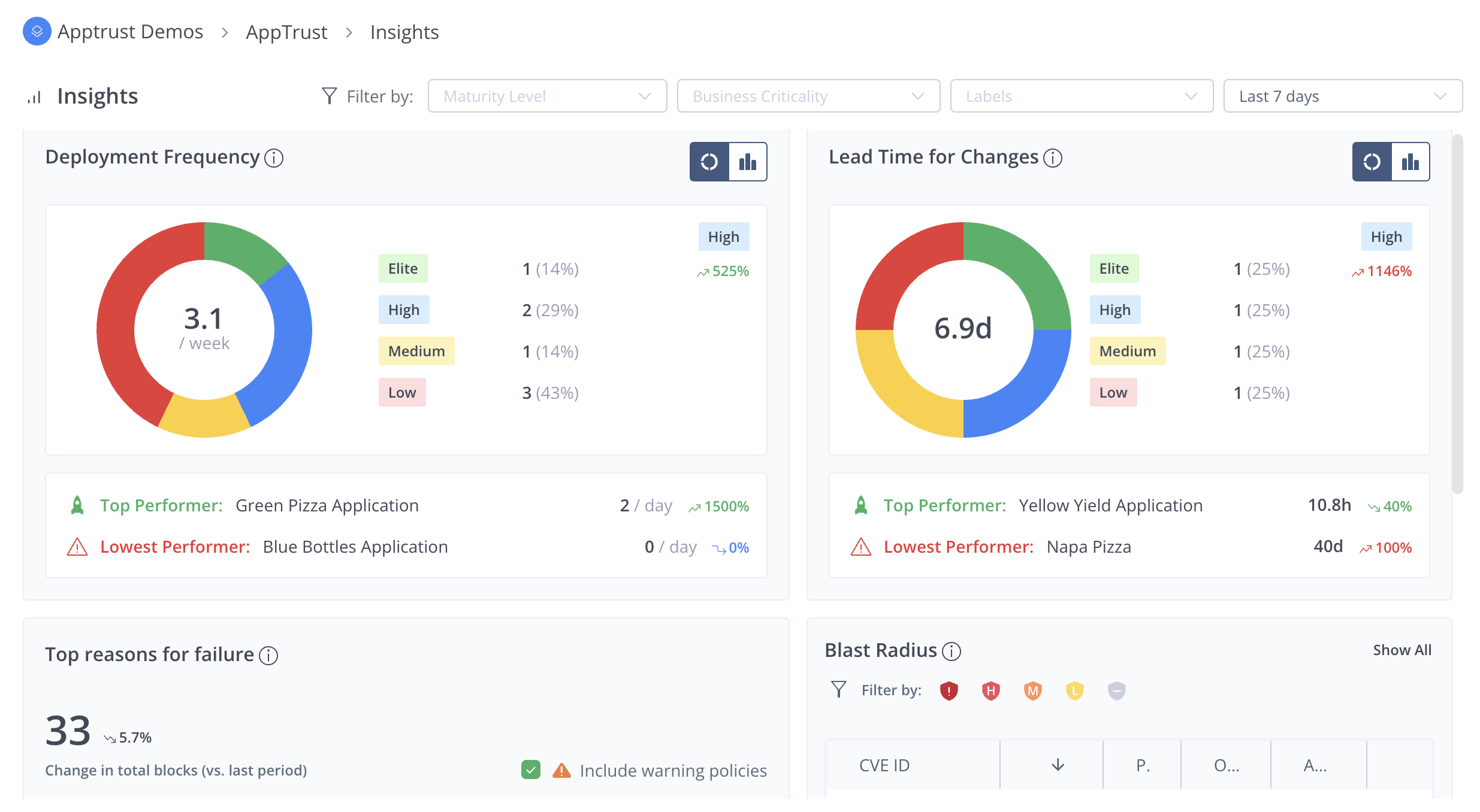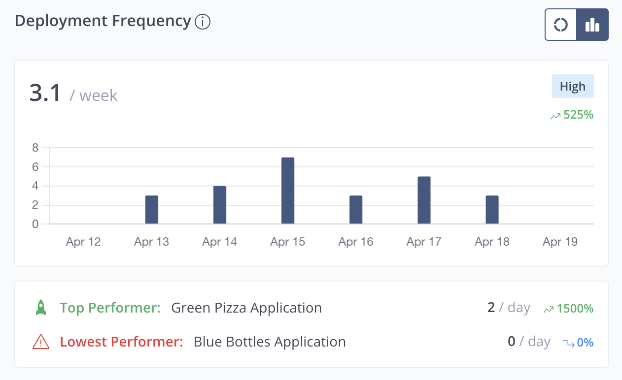 - Donut View: Number of applications falling into each DORA tier (Elite, High, Medium, Low) based on each application’s deployment frequency.