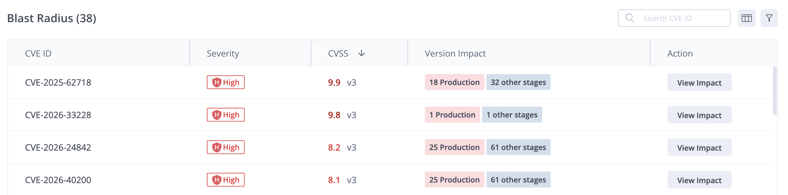 To see the full impact of a CVE, click the eye icon in the overview table or View Impact in the full view table.