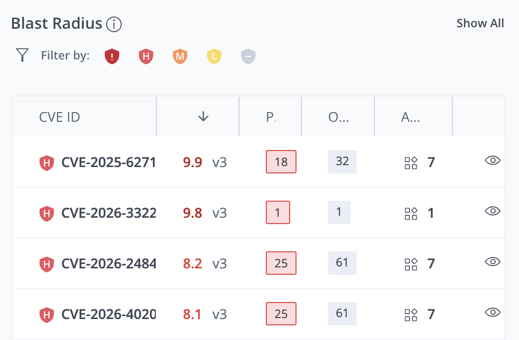 To open the full-size Blast Radius table, click Show All in the upper right corner of the Blast Radius area. This table shows the full list of CVEs and the same information about each CVE.
