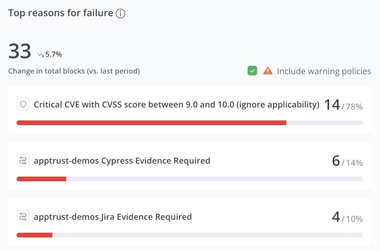 This panel shows the top five policy rules that create the most delivery friction across the project by aggregating policy evaluations from all applications and lifecycle stages. Top Reasons for Failure ranks rules by how often evaluations end in Fail (and optionally Warning) so you can prioritize the biggest recurring blockers.