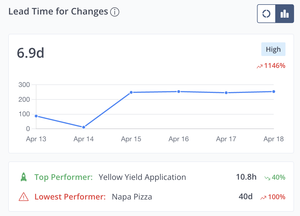 - Donut View: Number of applications that fall into each DORA tier (Elite, High, Medium, Low) when each application is classified from its own median lead time. This is useful for spotting a concentration of slow or fast applications.