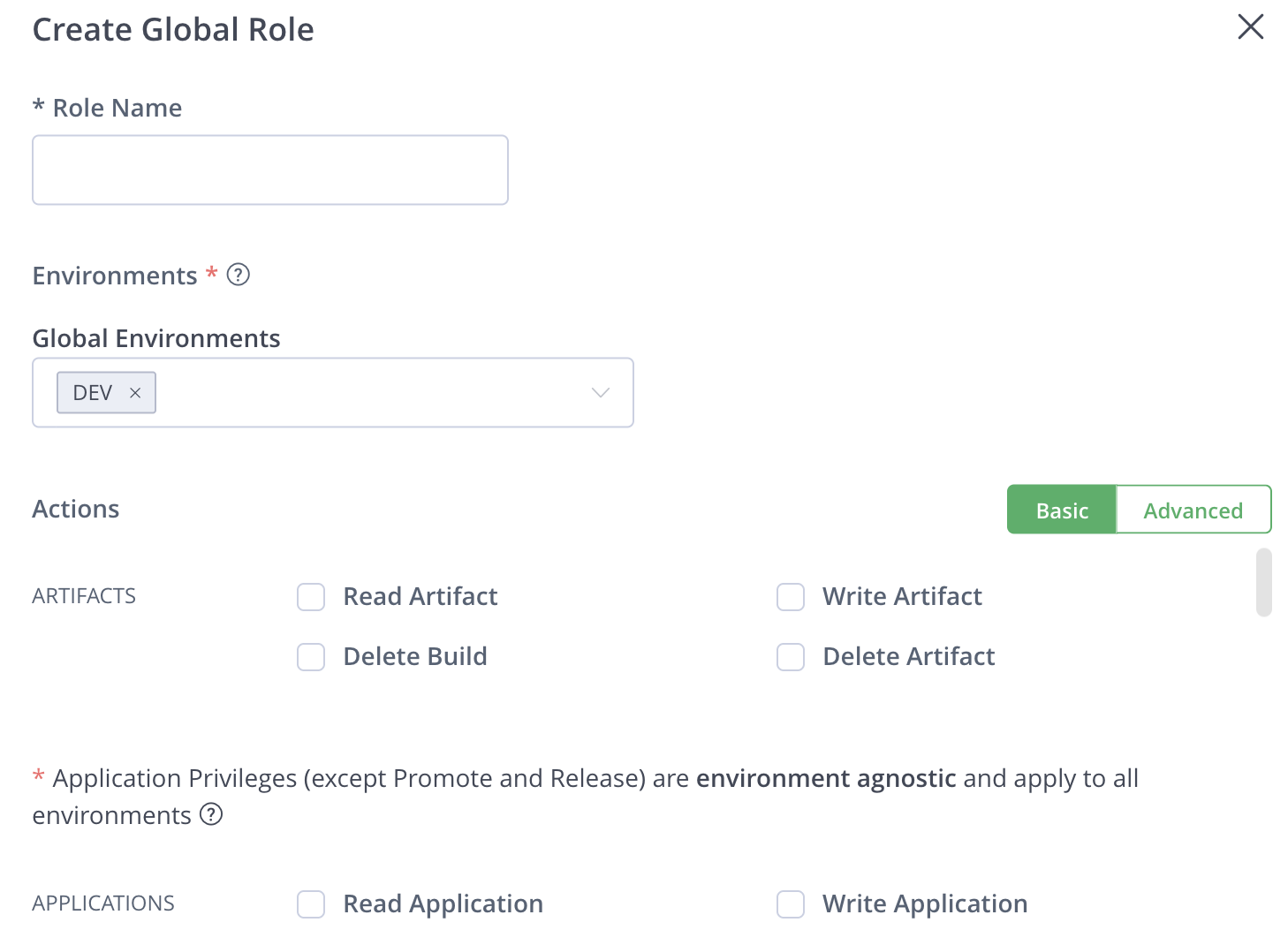 - Global Environments: From the dropdown, choose the stages this role can promote to, for example, DEV and QA. For a global role, you can only choose global stages.