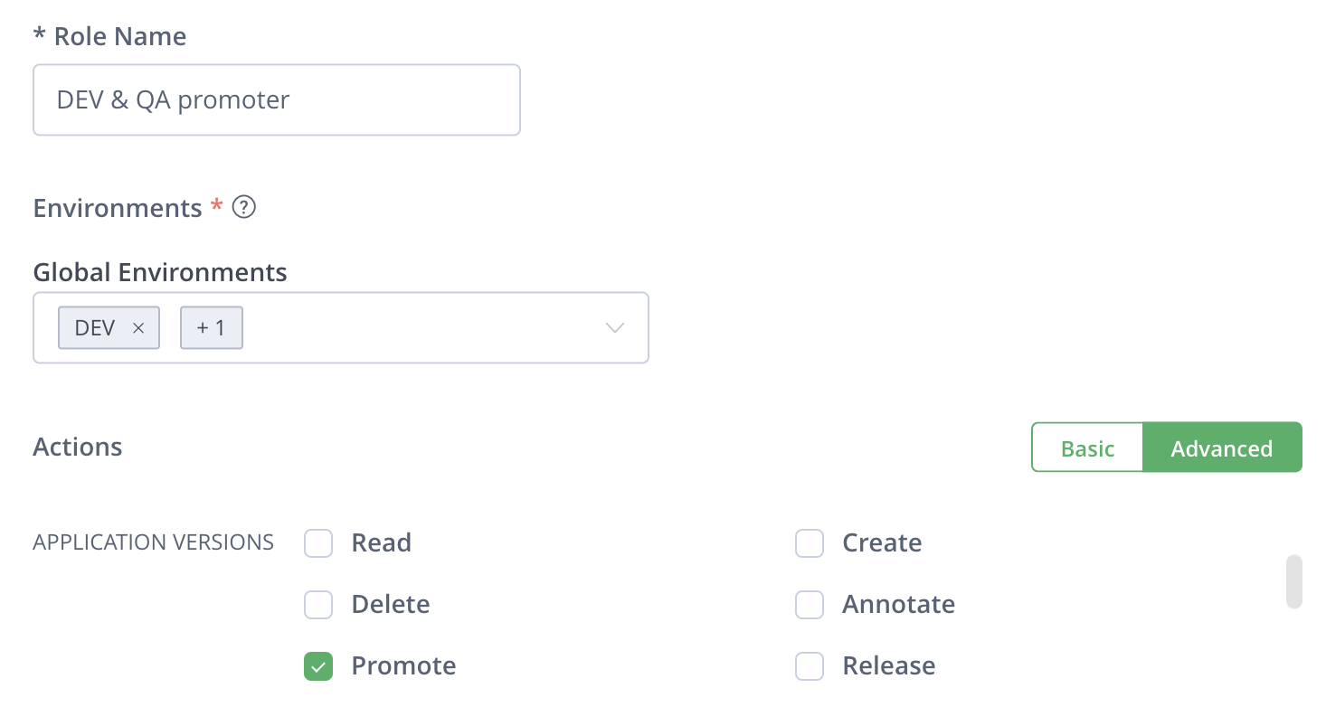 - Promote: Grants the ability to promote an application version to a non-production stage. The permission is stage-aware, meaning you can scope it to specific stages in the lifecycle.