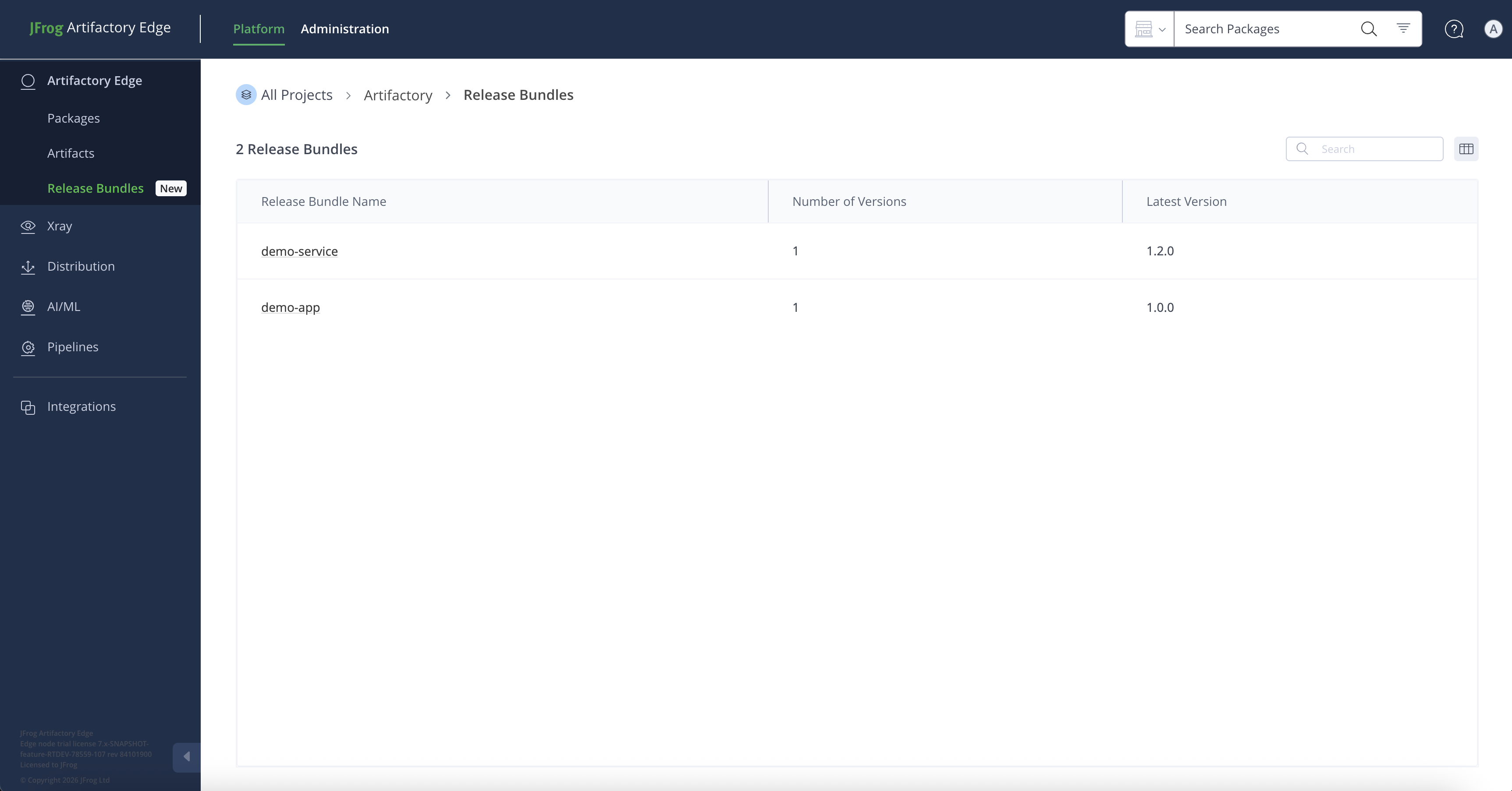 - In the Platform module, select Artifactory Edge > Release Bundles.