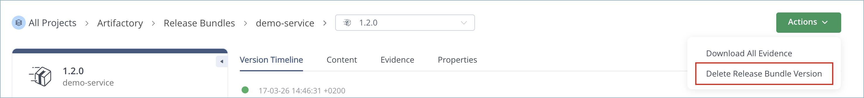 In the confirmation window, click Delete. The Release Bundle version and its artifacts are deleted. Related evidence is also deleted.