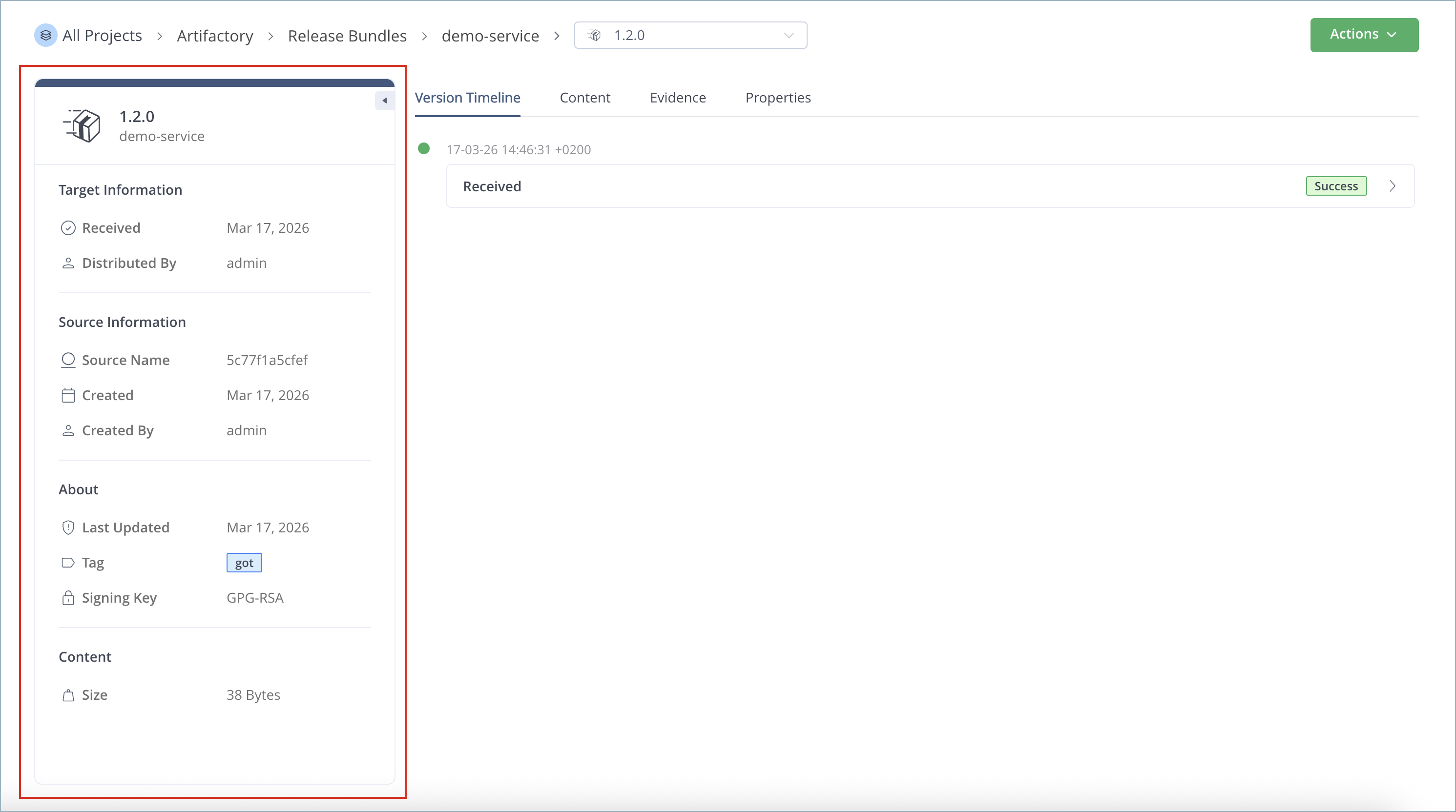 Click the Actions button to perform the following actions on a received Release Bundle v2 version: