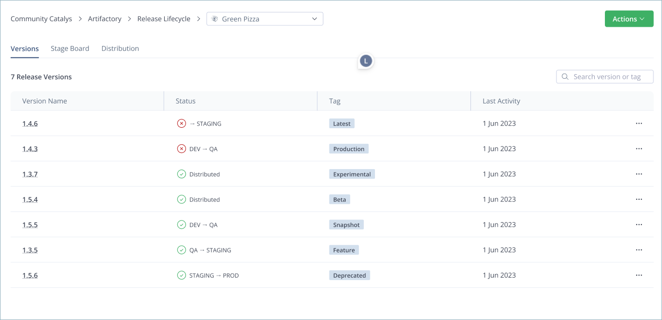 - Click the name of the relevant Release Bundle. The Versions tab, which is displayed by default, contains the following information about each version: