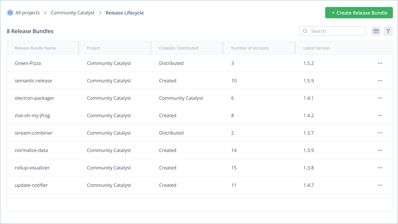 - In the Platform module, select Artifactory > Release Lifecycle. The Release Bundles page displays the following information about each Release Bundle v2: