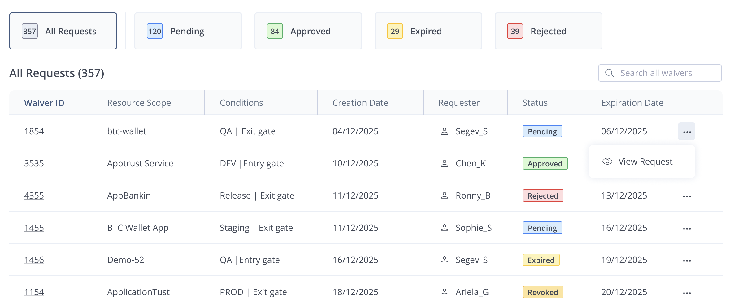 - In the JFrog Platform, go to AppTrust > Waivers. The list of waiver requests appears, showing the most recent requests of all statuses.