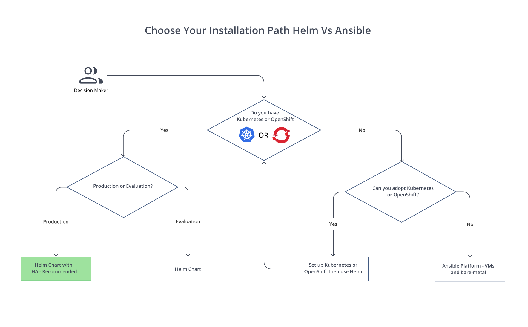 Use this decision tree to choose the right installation path. If you have Kubernetes (including OpenShift), the Helm chart is the recommended approach.