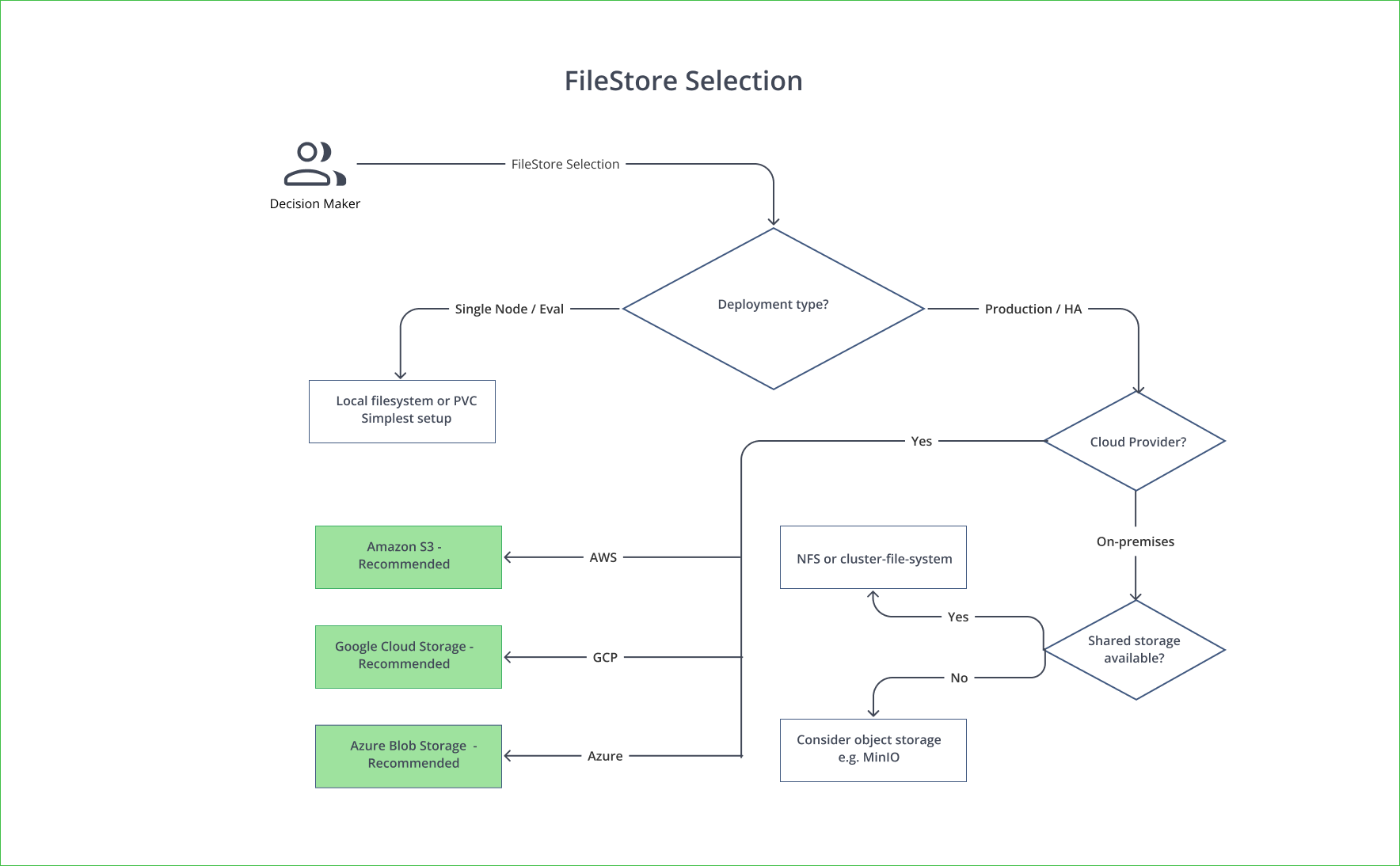 | Object Storage (S3/GCS/Azure Blob) | NFS / Shared Filesystem | Local Filesystem (PVC) | |