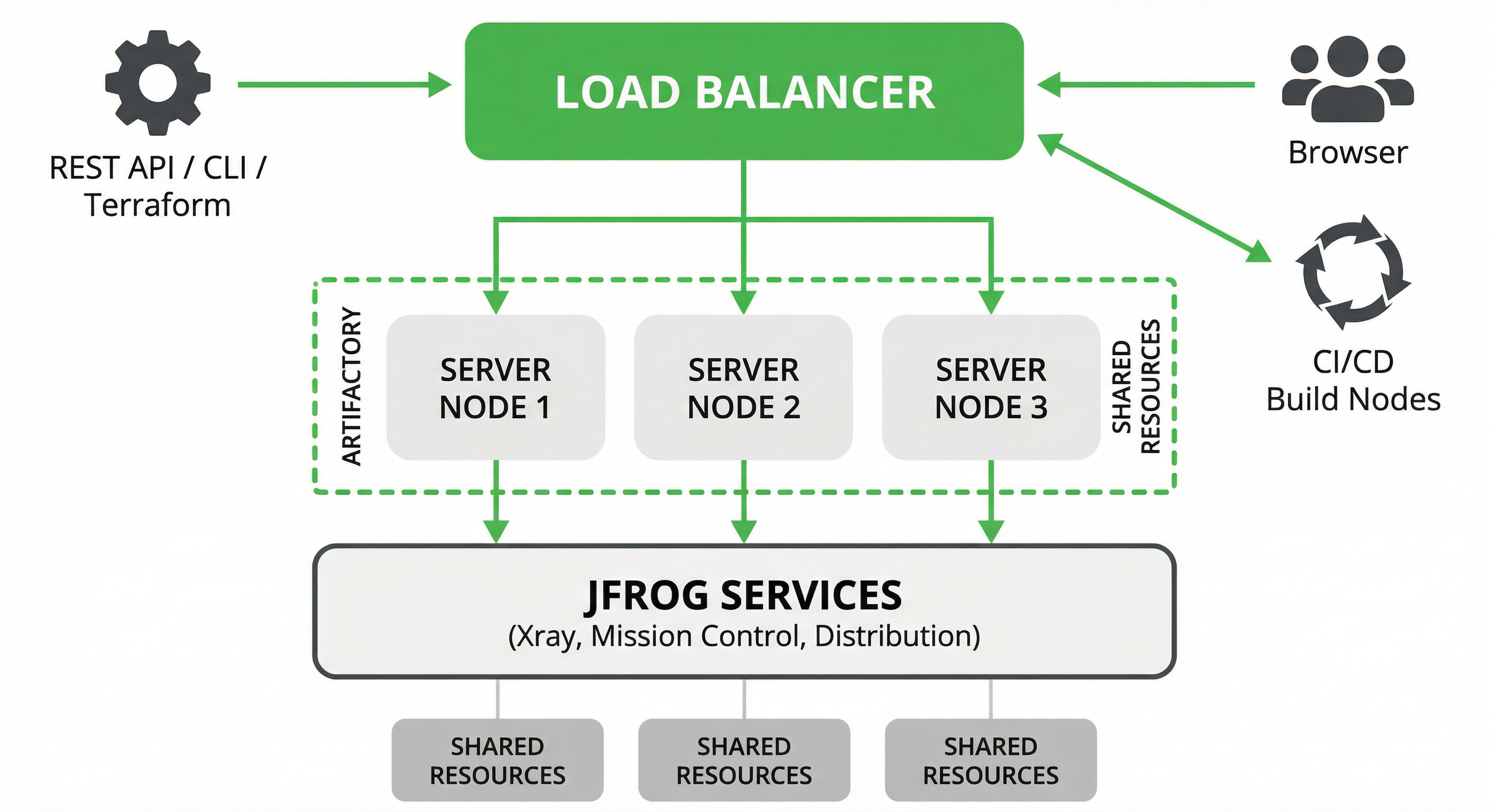 The load balancer is the entry point to your JFrog Platform Deployment (JPD) and optimally distributes requests to the nodes in your system. It is only required for the Artifactory service, which is then responsible to route and balance between the nodes of the other services. For more information, see Load Balancer.