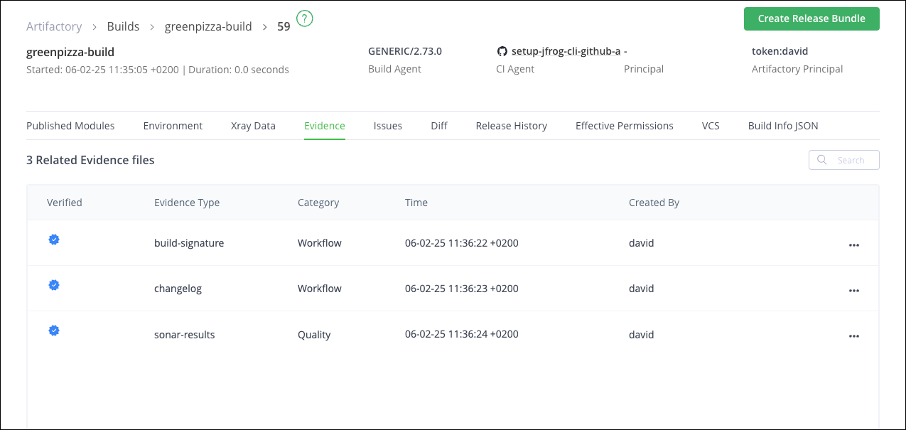 Evidence | The Evidence tab displays the evidence files that are associated with the build. For more information, see Evidence Management. |