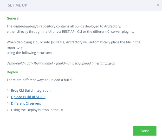 When a new project is created, a corresponding build-info repository is automatically created for the project. The naming convention of the build-info repository is:<project key>-build-info. For example, for a project named docker-local, the build-info repository name will be:docker-local-build-info. Note that the build-inforepository is created by the system repository and cannot be deleted by the Platform Admin or Project Admin.