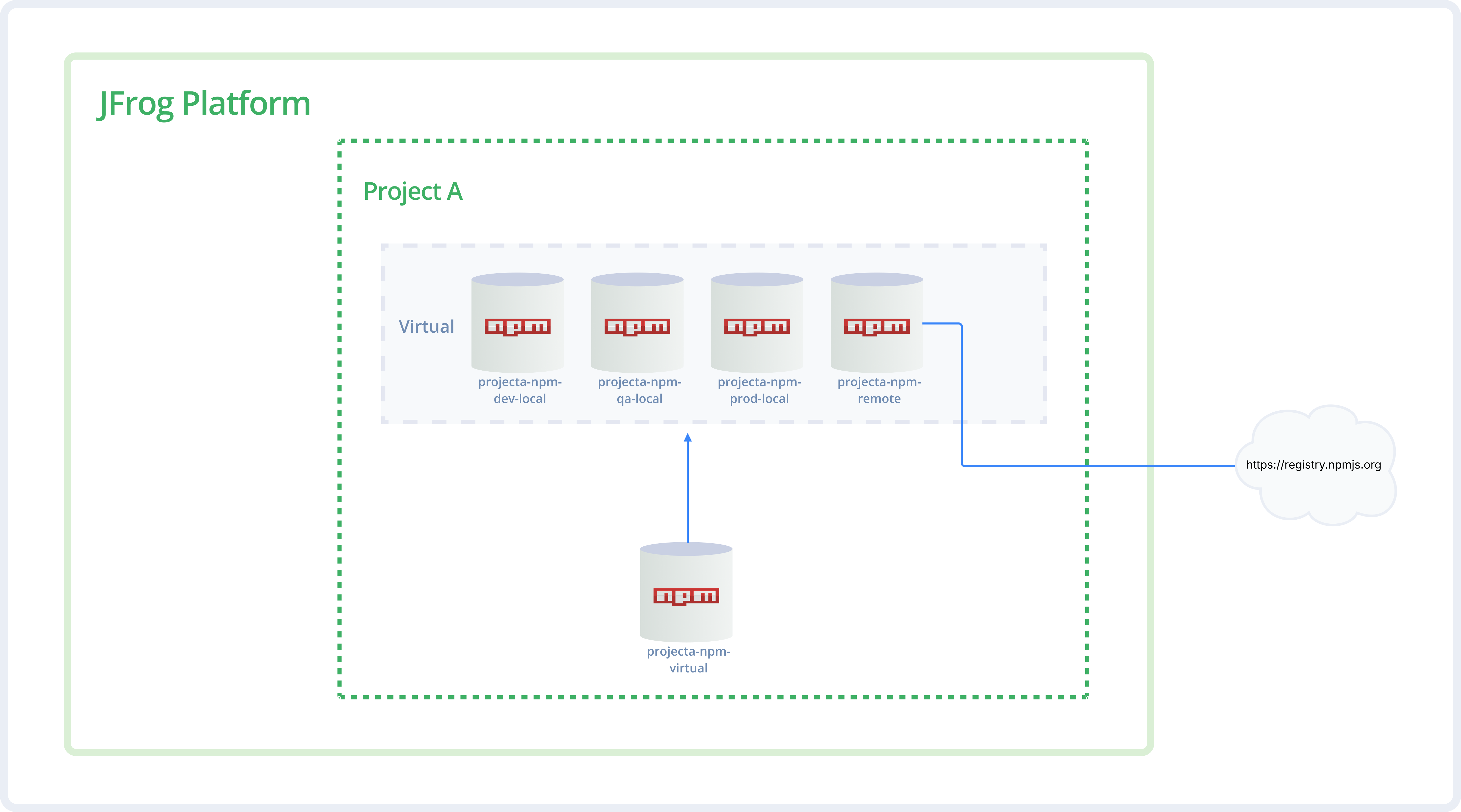 The following diagram illustrates the virtual wrapper concept using npm. Notice how a single virtual repository aggregates both local and remote npm repositories, providing developers with a single URL for all package resolution.