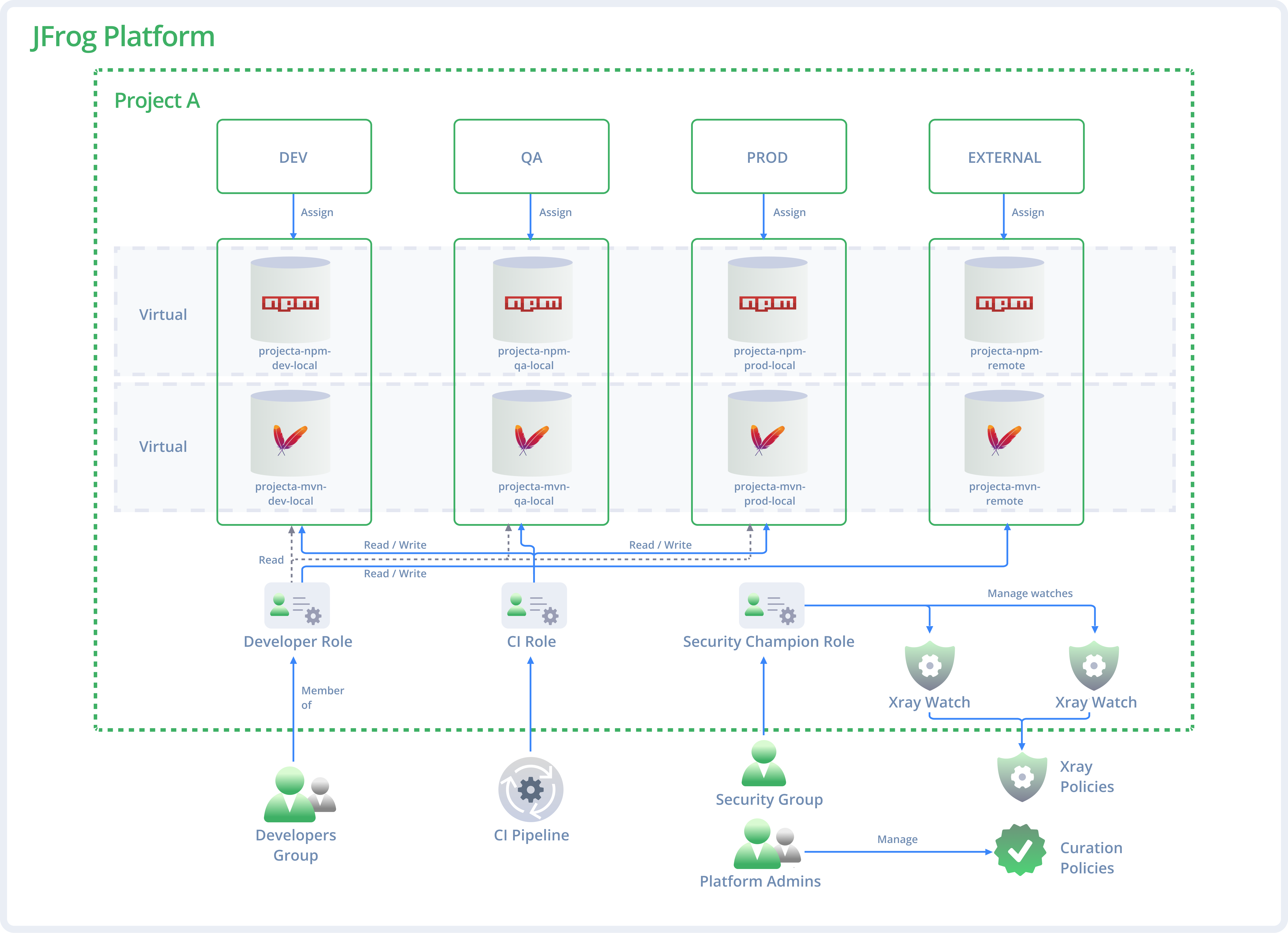 This section provides structural guidelines for setting up your environment. It assumes a foundational understanding of JFrog concepts such as Projects, Stages, and Repositories. For more information about configuring these entities, see Basic Projects Terminology.