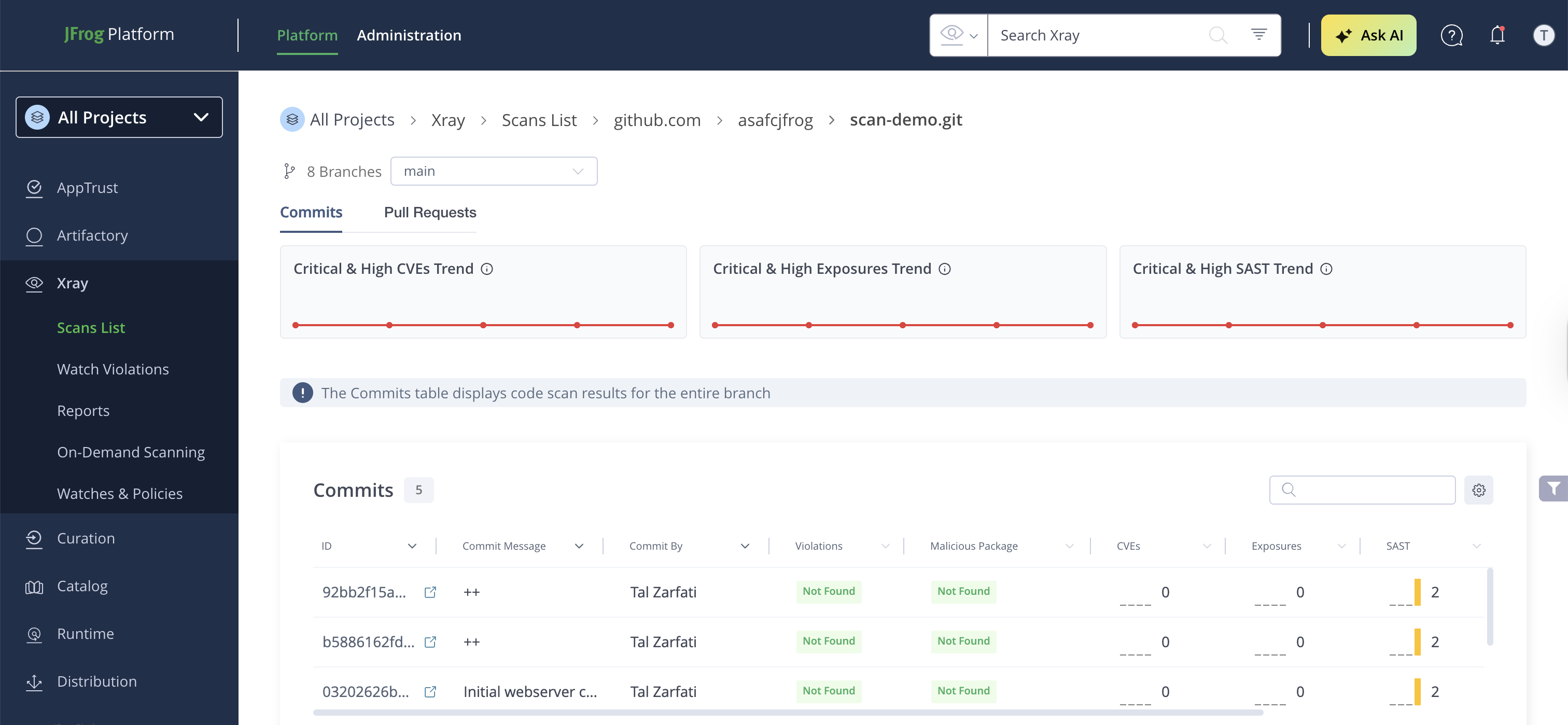 All Frogbot scan results are uploaded to the JFrog Platform and are available under Xray Scans List. This provides a centralized view of security findings across all your Git repositories.