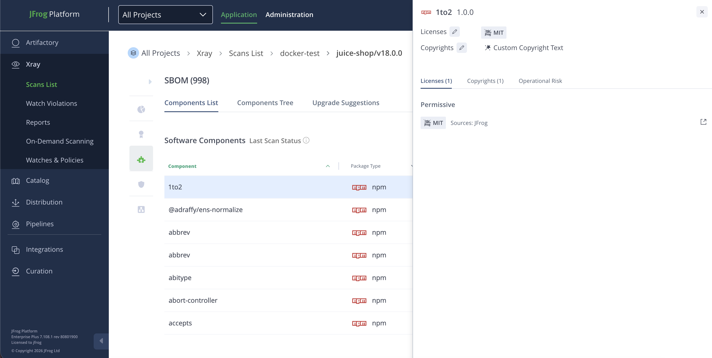 - Copyright Editing : Replace the set of copyright notices attached to a component. This requires the SBOM capability to be enabled on the Xray instance.